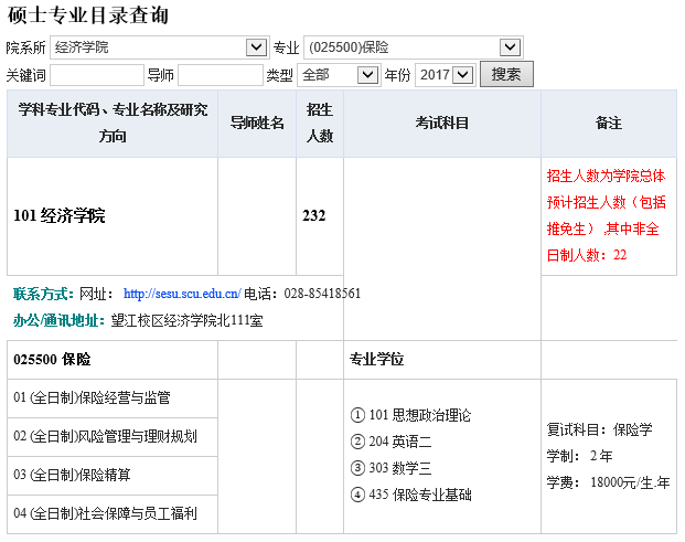 四川大学保险硕士研究生2017年招生目录
