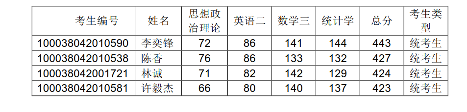 统考生:总分380分,政治、外语单科50分,数学三、统计学单科100 分。不招收调剂生。