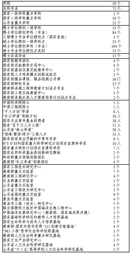 学校有崂山校区、鱼山校区和浮山校区3个校区,占地2400余亩。设有18个学院和1个基础教学中心。现有全日制在校生25700余人,其中本科生15300余人、硕士研究生7500余人、博士研究生1800余人。教职工3300余人,其中专任教师1700余人,博士生导师360余人、正高级专业技术人员570余人、副高级专业技术人员650余人,中国科学院院士5人、中国工程院院士5人。著名作家王蒙担任学校顾问、文学与新闻传播学院名誉院长,国家海洋局原局长王曙光受聘学校顾问、海洋发展研究院院长,国际著名物理学家钱致榕受聘学校顾问、特聘讲席教授、行远书院院长,诺贝尔文学奖获得者莫言等12位知名作家受聘为学校“驻校作家”。