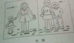 As is vividly described in the left part of the drawing, thirty years ago, there stood a delicate mother, holding the tiny hand of a lovely girl, who wore a red scarf. On the contrary, the right part of the picture illustrates that with time flying quickly, the little girl, who has already grown up as a gorgeous lady, is supporting her old mother. We are informed: accompanying.