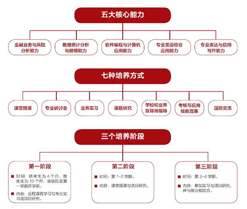金融硕士(风险管理方向)培养内容主要集中在专业基础知识、专业应用技能、研究能力、视野拓展、品格与行为习惯五个维度,按照五大核心能力的培养目标、七种培养方式和三个强化培养阶段展开,旨在全面提升学生的综合素质与能力。